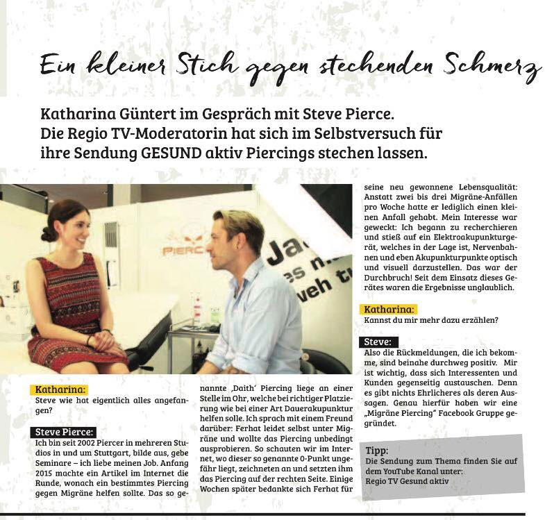 GESUND aktiv Categories: News, PrintVon Steve31. März 2022 Autor: Steve KommentarnavigationZurückVorheriger Beitrag:Piercingmagazin YoulindoNächstesNächster Beitrag:Kundenbericht VideoRelated PostsPodcast: KIMamMIK – Steve Pierce im Interview18. April 2023www.janes-magazin.de: Linderung von Regel- oder Endometriose Schmerzen – kann die Piercingpunktur® auch bei solchen Beschwerden unterstützen?12. Dezember 2022www.superchat.de: Für Steve Pierce gehört das Nachrichten-Chaos der Vergangenheit an17. Oktober 2022Berliner Sonntagsblatt: Steve Pierce – Piercingpunktur statt Akupunktur?17. Oktober 2022Steve Pierce im Interview bei TV Mittelrhein in der Sendung „Unternehmer im Portrait“14. Juli 2022Neuer Schmuck im Studio verfügbar7. Juni 2022